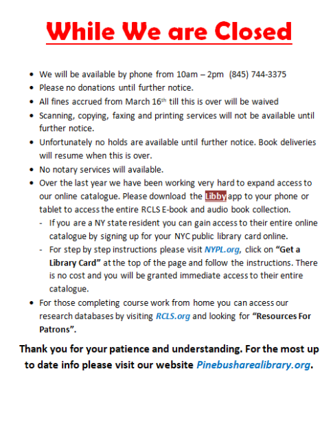 Here is what you can do while the Pine Bush Library is closed: Image Posted on March 16, 2020 by pinebushlibrary Share this: Click to share on Facebook (Opens in new window) Facebook Click to print (Opens in new window) Print Click to email a link to a friend (Opens in new window) Email Click to share on LinkedIn (Opens in new window) LinkedIn Like Loading... Related