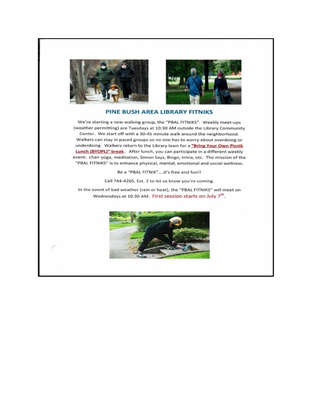 Walk with the Pine Bush Area Library Fitniks!! Image Posted on June 26, 2020 by pinebushlibrary Share this: Share on Facebook (Opens in new window) Facebook Print (Opens in new window) Print Email a link to a friend (Opens in new window) Email Share on LinkedIn (Opens in new window) LinkedIn Like Loading... Related