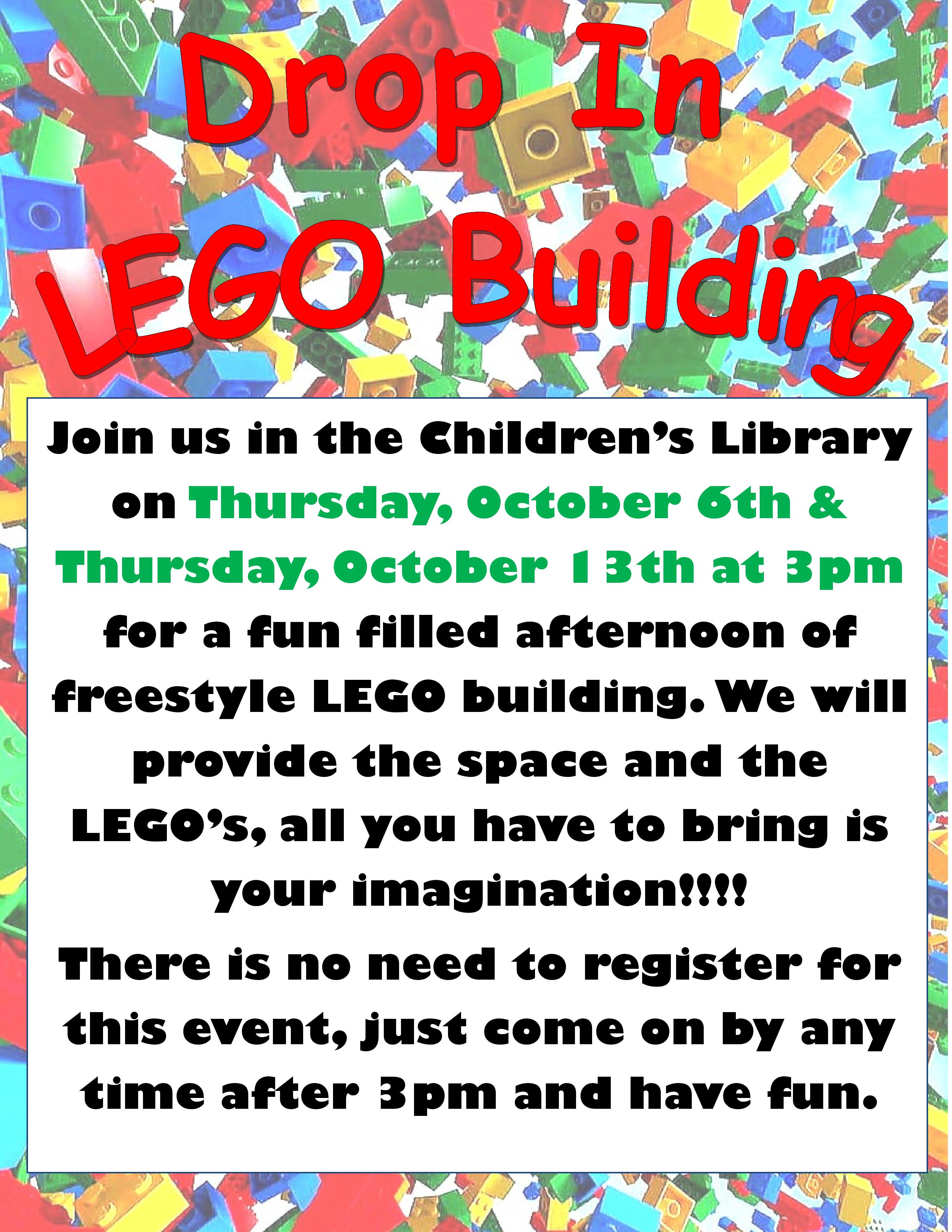 Drop in LEGO building is NOT happening on October 10th, we are closed on October 10th. It is however happening tomorrow and on the 13th. Sorry for any confusion, blame the person that runs our social media accounts.