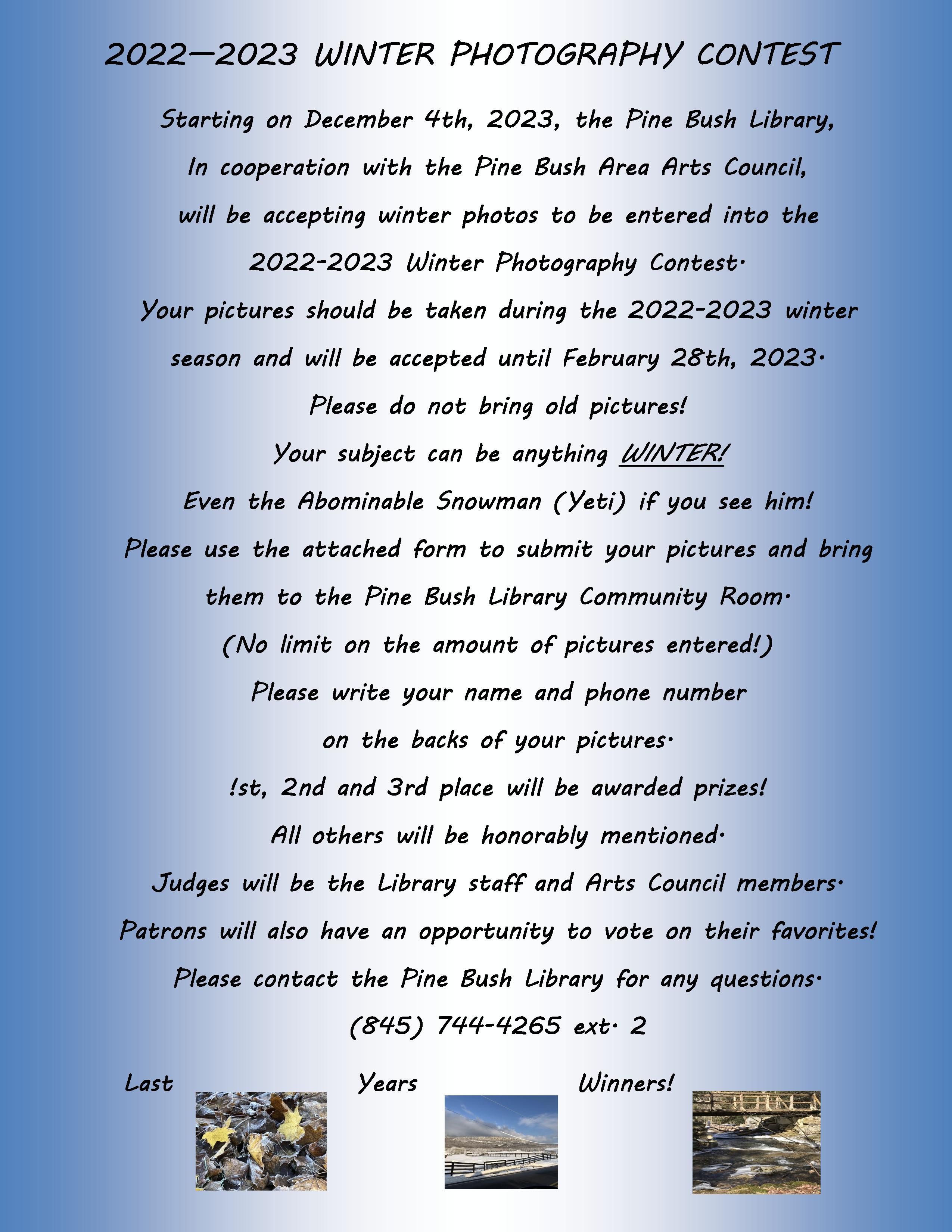 2022 – 2023 Photo Contest EXTENDED!!!!! Posted on February 9, 2023 by pinebushlibrary The final day to submit your photos is now February 28th. Share this: Click to share on Facebook (Opens in new window) Facebook Click to print (Opens in new window) Print Click to email a link to a friend (Opens in new window) Email Click to share on LinkedIn (Opens in new window) LinkedIn Like Loading... Related