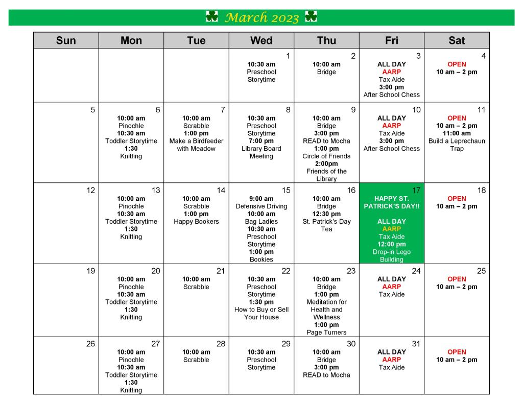 Here is the correct Library Calendar for March. Knitting was left off the one we original one we posted. If you want a hard copy, they are available at the library and community center.