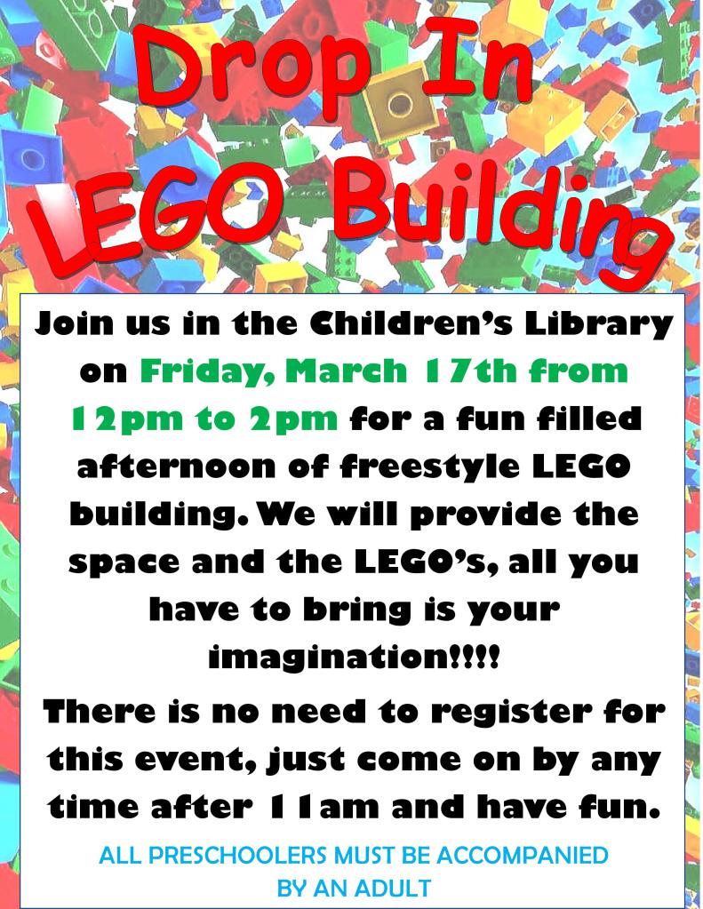Come Play With LEGO’s Image Posted on March 6, 2023 by pinebushlibrary Share this: Click to share on Facebook (Opens in new window) Facebook Click to print (Opens in new window) Print Click to email a link to a friend (Opens in new window) Email Click to share on LinkedIn (Opens in new window) LinkedIn Like Loading... Related