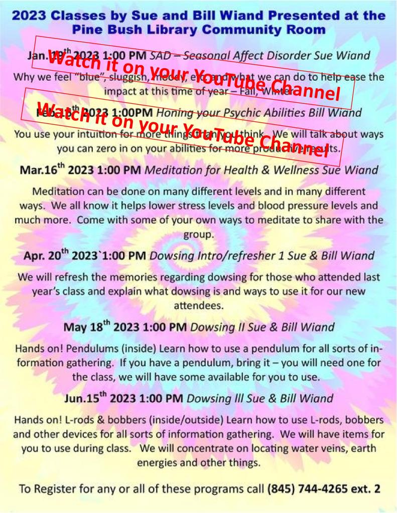 Here is a list of the classes presented by Bill & Sue Wiand at the Pine Bush Library Community Center. You can call 845-744-4265 ext.2 to sign up for one or all of the future classes.