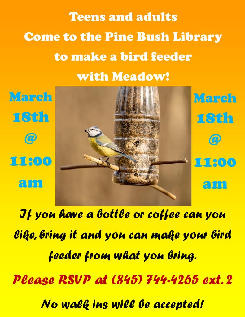 Posted on March 10, 2023 by pinebushlibrary Making a Bird Feeder with Meadow has been rescheduled for Saturday, March 18th at 11:00am. Share this: Click to share on Facebook (Opens in new window) Facebook Click to print (Opens in new window) Print Click to email a link to a friend (Opens in new window) Email Click to share on LinkedIn (Opens in new window) LinkedIn Like Loading... Related