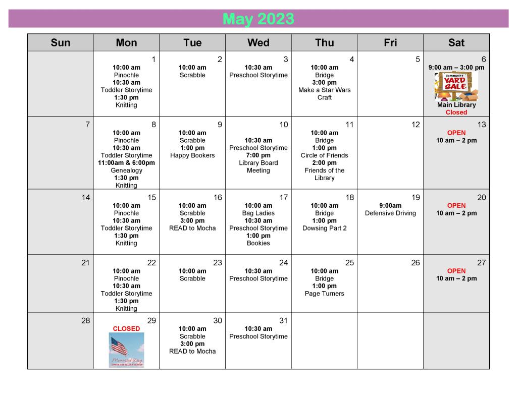 May Calendar Image Posted on April 28, 2023 by pinebushlibrary Share this: Click to share on Facebook (Opens in new window) Facebook Click to print (Opens in new window) Print Click to email a link to a friend (Opens in new window) Email Click to share on LinkedIn (Opens in new window) LinkedIn Like Loading... Related