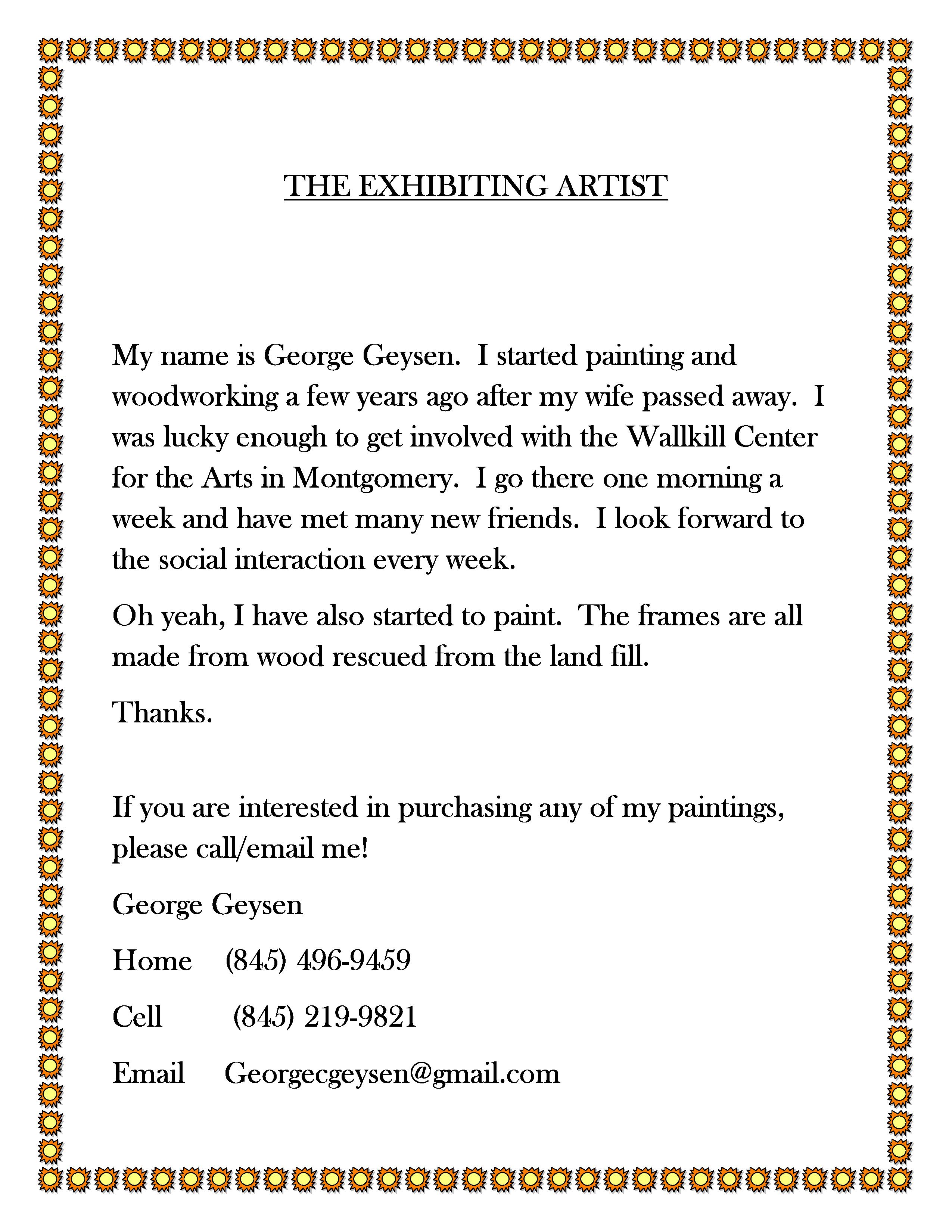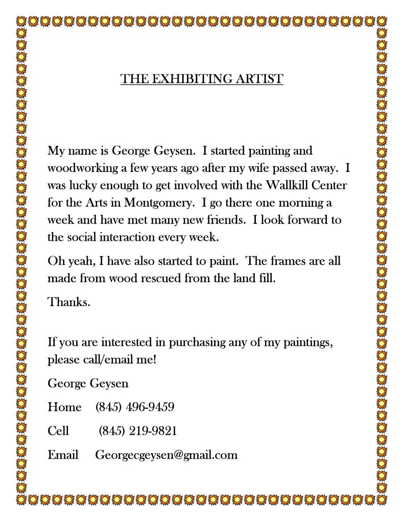 Posted on May 3, 2023 by pinebushlibrary The Pine Bush Library would like to thank George Geysen for exhibiting his paintings in the main library this month. Share this: Click to share on Facebook (Opens in new window) Facebook Click to print (Opens in new window) Print Click to email a link to a friend (Opens in new window) Email Click to share on LinkedIn (Opens in new window) LinkedIn Like Loading... Related
