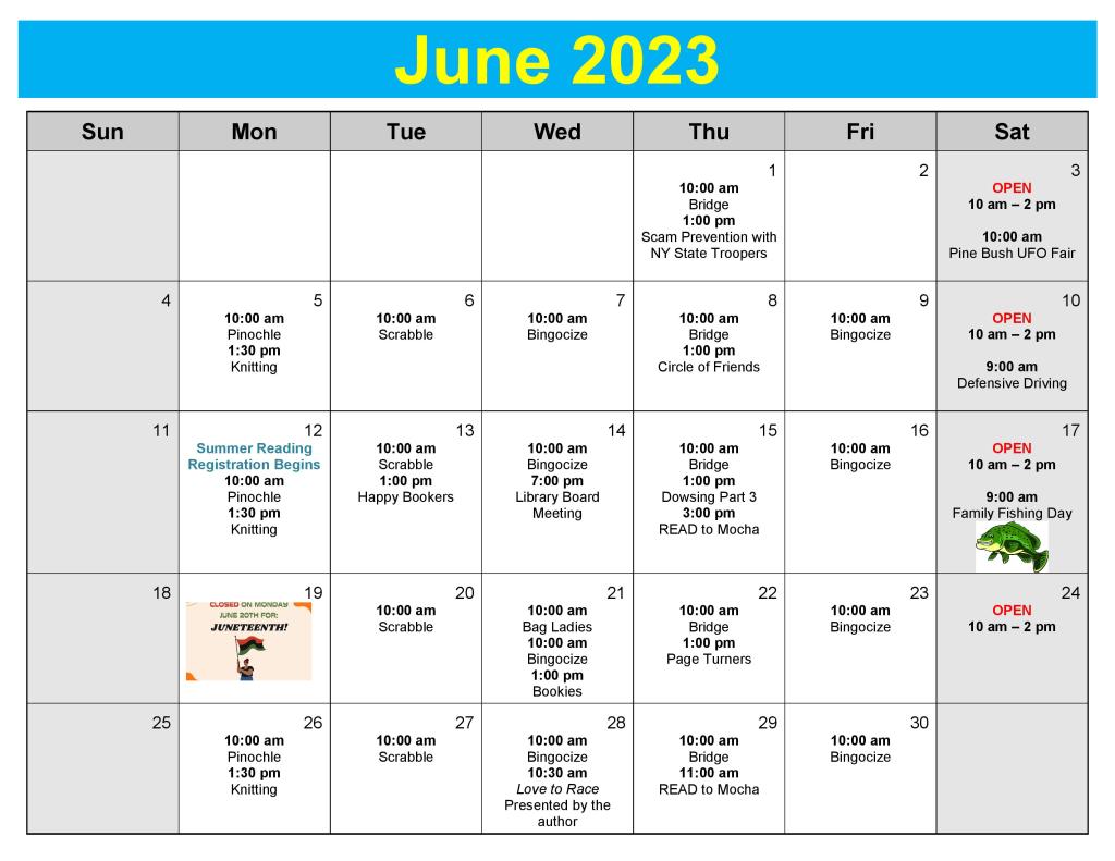 June 2023 Calendar Image Posted on May 26, 2023 by pinebushlibrary Share this: Click to share on Facebook (Opens in new window) Facebook Click to print (Opens in new window) Print Click to email a link to a friend (Opens in new window) Email Click to share on LinkedIn (Opens in new window) LinkedIn Like Loading... Related
