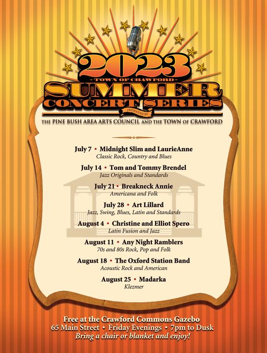 Posted on July 5, 2023 by pinebushlibrary The Town of Crawford Summer Concert Series kicks off in only 2 days. Share this: Click to share on Facebook (Opens in new window) Facebook Click to print (Opens in new window) Print Click to email a link to a friend (Opens in new window) Email Click to share on LinkedIn (Opens in new window) LinkedIn Like Loading... Related