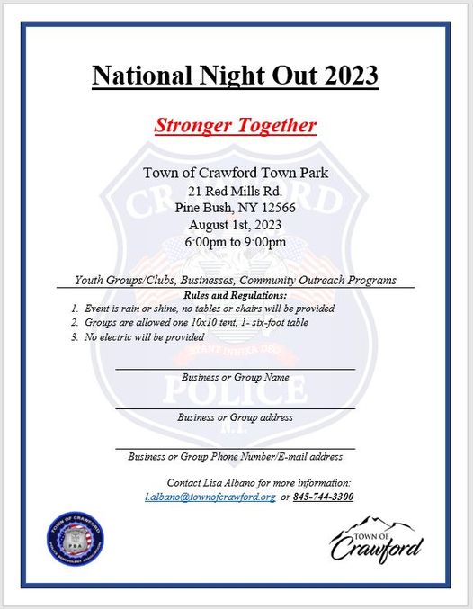 Posted on July 28, 2023 by pinebushlibrary National Night Out 2023 takes place this coming Tuesday. If you are interested in setting up a space, contact Lisa at the number/email listed below. Share this: Click to share on Facebook (Opens in new window) Facebook Click to print (Opens in new window) Print Click to email a link to a friend (Opens in new window) Email Click to share on LinkedIn (Opens in new window) LinkedIn Like Loading... Related