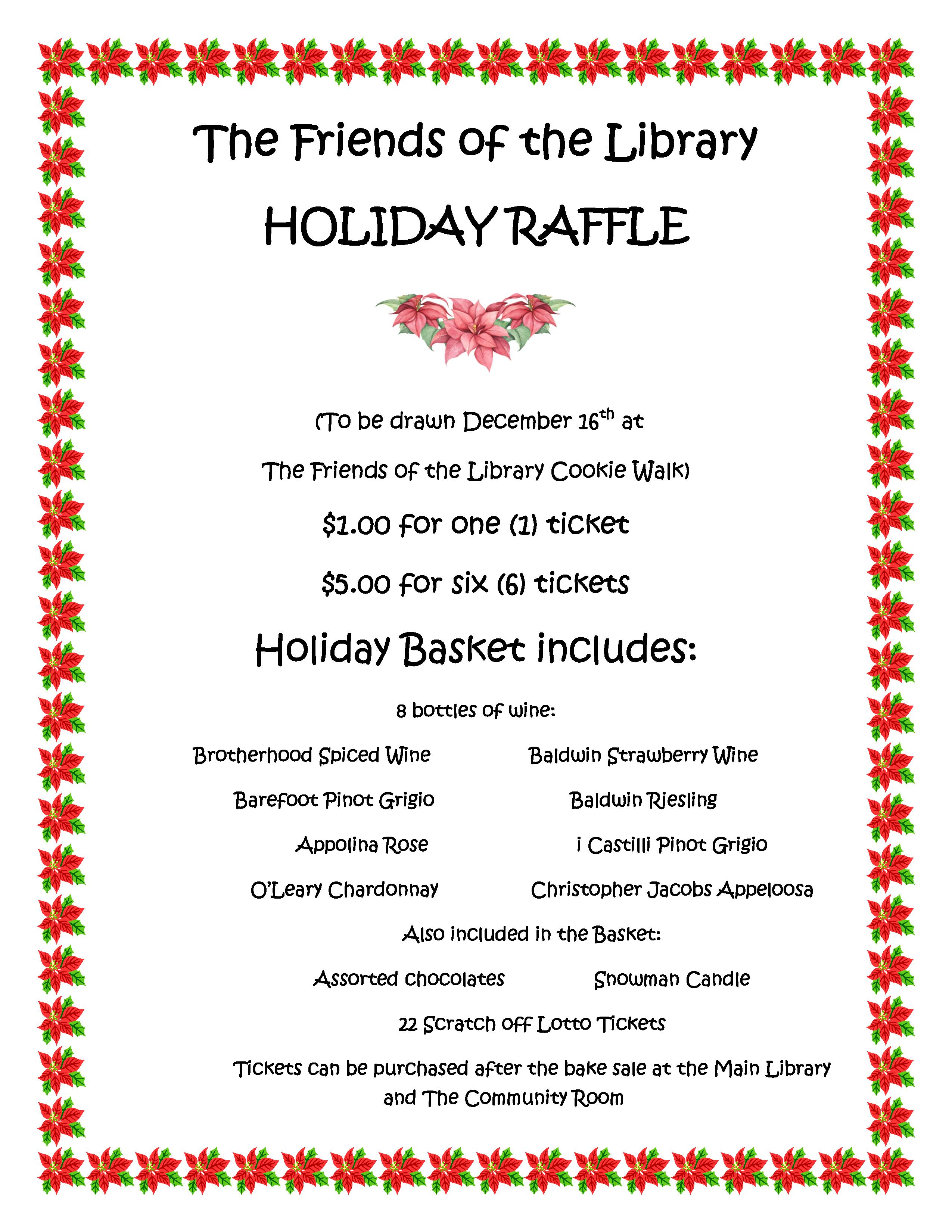 Posted on November 27, 2023 by pinebushlibrary Our holiday basket raffle has begun!!! Come by the library community canter and get your tickets before December 16th. Tickets are $1 each for 6 for $5 Share this: Click to share on Facebook (Opens in new window) Facebook Click to print (Opens in new window) Print Click to email a link to a friend (Opens in new window) Email Click to share on LinkedIn (Opens in new window) LinkedIn Like Loading... Related
