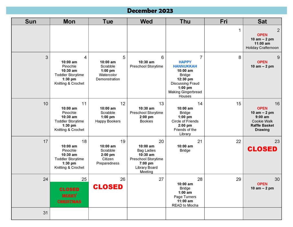 December Calendar Posted on November 29, 2023 by pinebushlibrary Our December Calendar is out. If you would like a physical copy, you can pick one up next time you visit. Share this: Click to share on Facebook (Opens in new window) Facebook Click to print (Opens in new window) Print Click to email a link to a friend (Opens in new window) Email Click to share on LinkedIn (Opens in new window) LinkedIn Like Loading... Related
