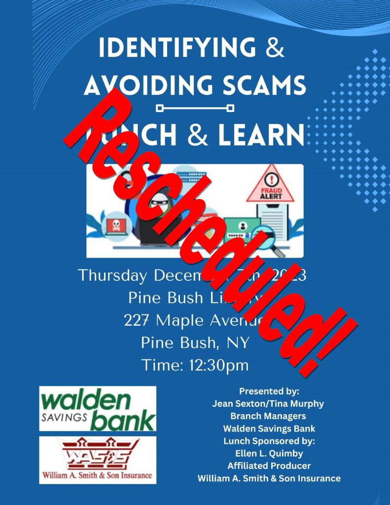 Rescheduled Posted on December 6, 2023 by pinebushlibrary Identifying and Avoiding Scams has been Rescheduled. We will post the new date as soon as we have it. Share this: Click to share on Facebook (Opens in new window) Facebook Click to print (Opens in new window) Print Click to email a link to a friend (Opens in new window) Email Click to share on LinkedIn (Opens in new window) LinkedIn Like Loading... Related