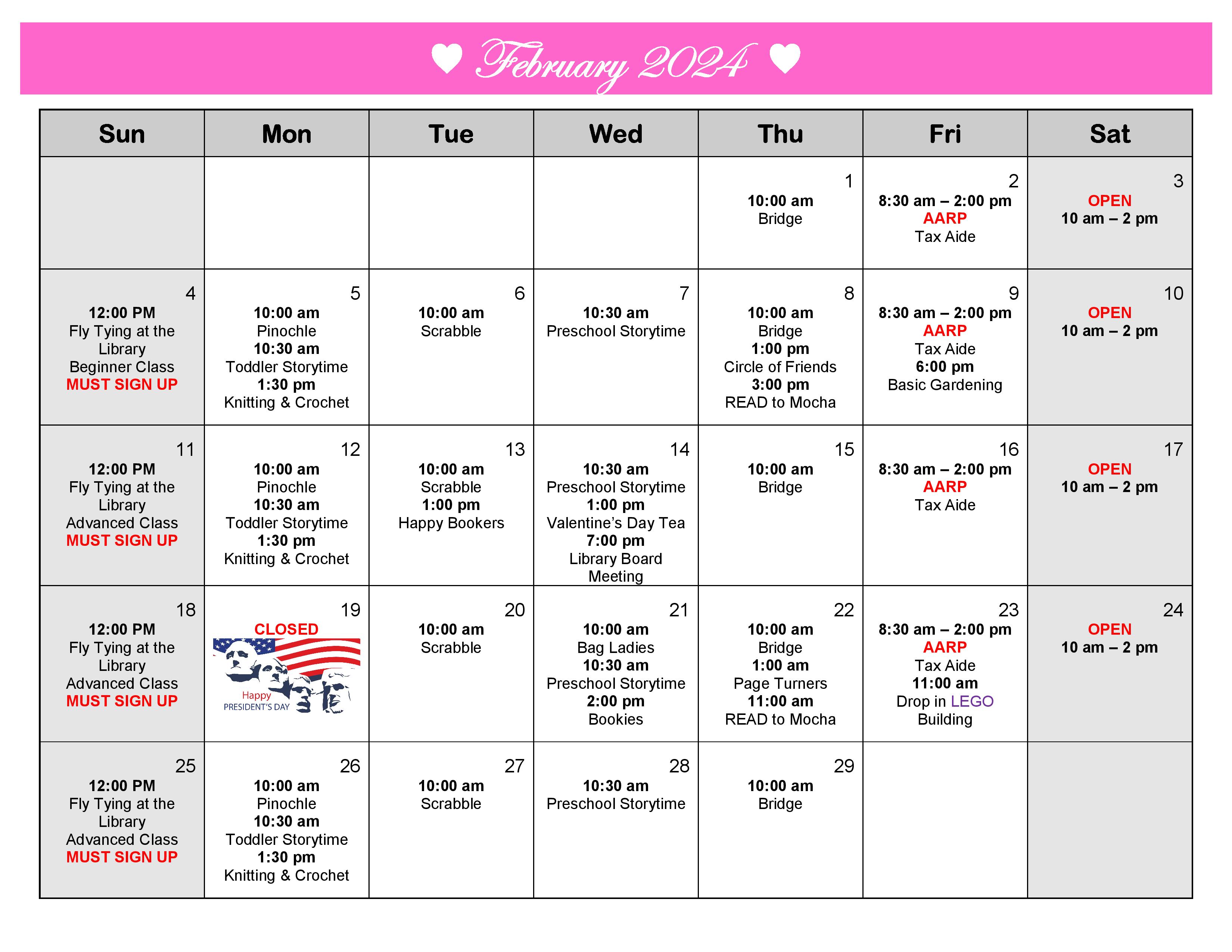 Posted on January 26, 2024 by pinebushlibrary Our February Calendar is out! If you would like a paper copy, you can pick one up on your next visit to the library. Share this: Click to share on Facebook (Opens in new window) Facebook Click to print (Opens in new window) Print Click to email a link to a friend (Opens in new window) Email Click to share on LinkedIn (Opens in new window) LinkedIn Like Loading... Related