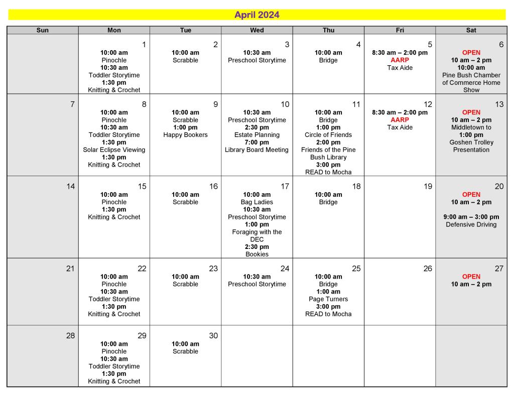 April Calendar is OUT Image Posted on March 29, 2024 by pinebushlibrary Share this: Click to share on Facebook (Opens in new window) Facebook Click to print (Opens in new window) Print Click to email a link to a friend (Opens in new window) Email Click to share on LinkedIn (Opens in new window) LinkedIn Like Loading... Related
