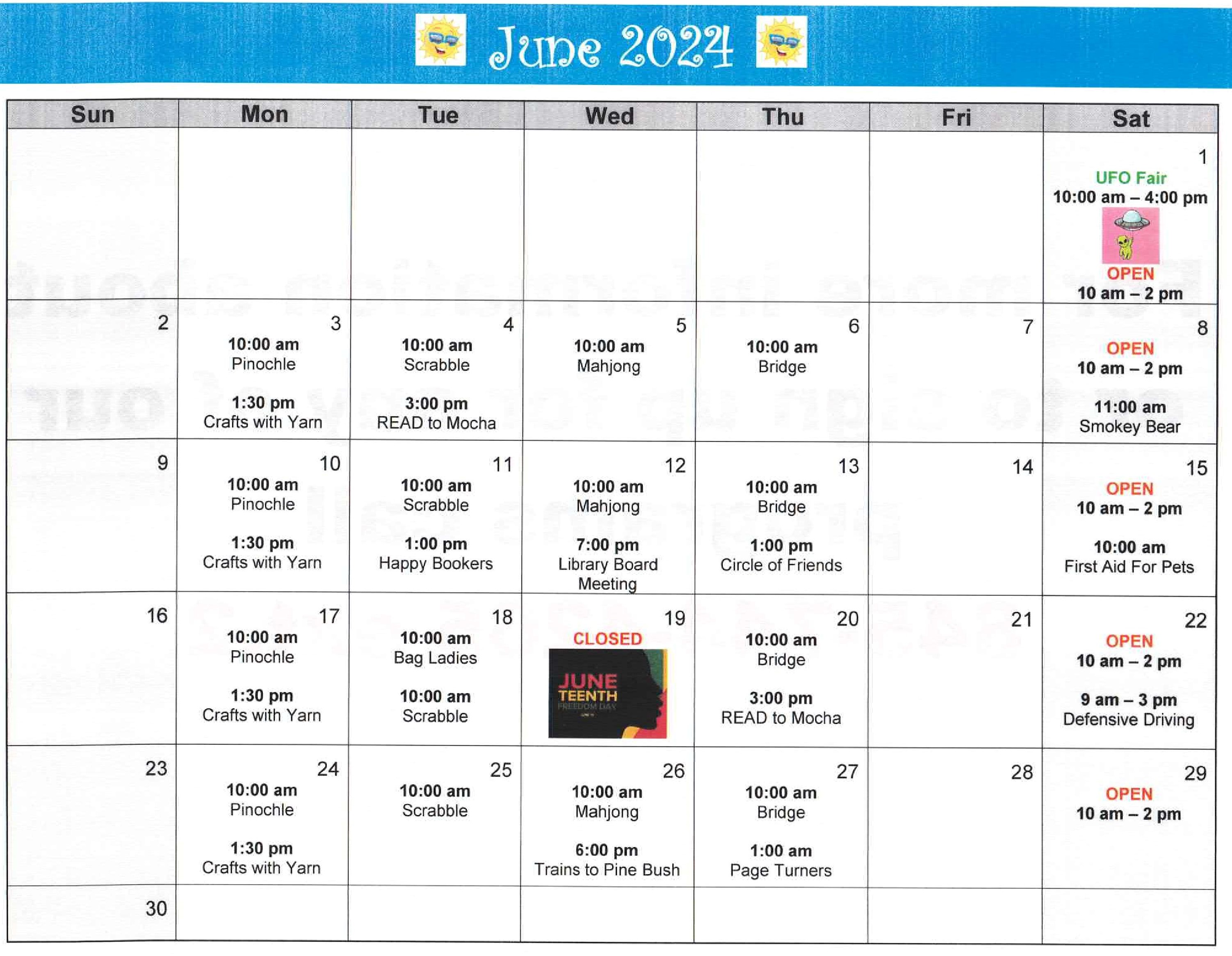 June Calendar Posted on May 30, 2024 by pinebushlibrary If you are interested in signing up for any of our upcoming events give us a call 845-744-4265 ext. 2 and reserve your spot. Share this: Click to share on Facebook (Opens in new window) Facebook Click to print (Opens in new window) Print Click to email a link to a friend (Opens in new window) Email Click to share on LinkedIn (Opens in new window) LinkedIn Like Loading... Related