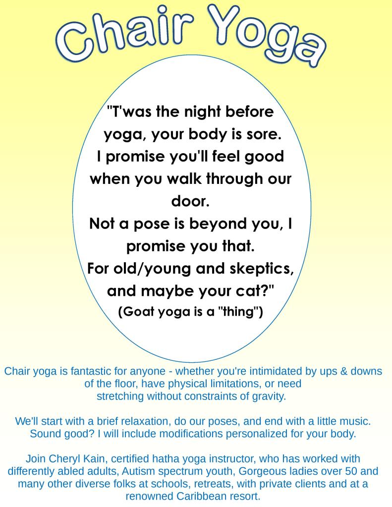 Posted on July 8, 2024 by pinebushlibrary Is anyone interested in Chair Yoga during the week? Share this: Click to share on Facebook (Opens in new window) Facebook Click to print (Opens in new window) Print Click to email a link to a friend (Opens in new window) Email Click to share on LinkedIn (Opens in new window) LinkedIn Like Loading... Related