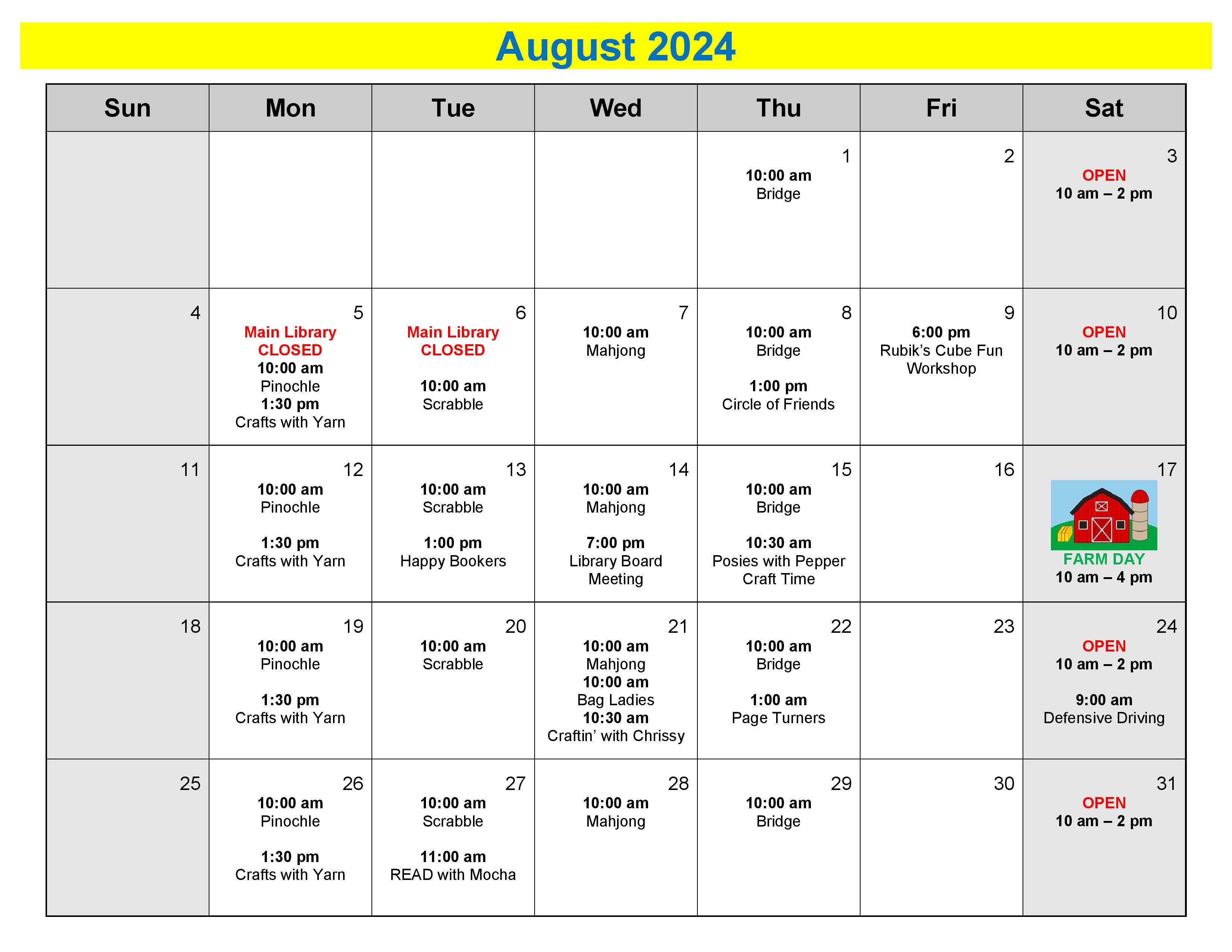 Posted on July 20, 2024 by pinebushlibrary Our August calendar is out! If you want anymore information about or to register for an upcoming event, give us a call 845-744-4265 ext.2 Share this: Click to share on Facebook (Opens in new window) Facebook Click to print (Opens in new window) Print Click to email a link to a friend (Opens in new window) Email Click to share on LinkedIn (Opens in new window) LinkedIn Like Loading... Related