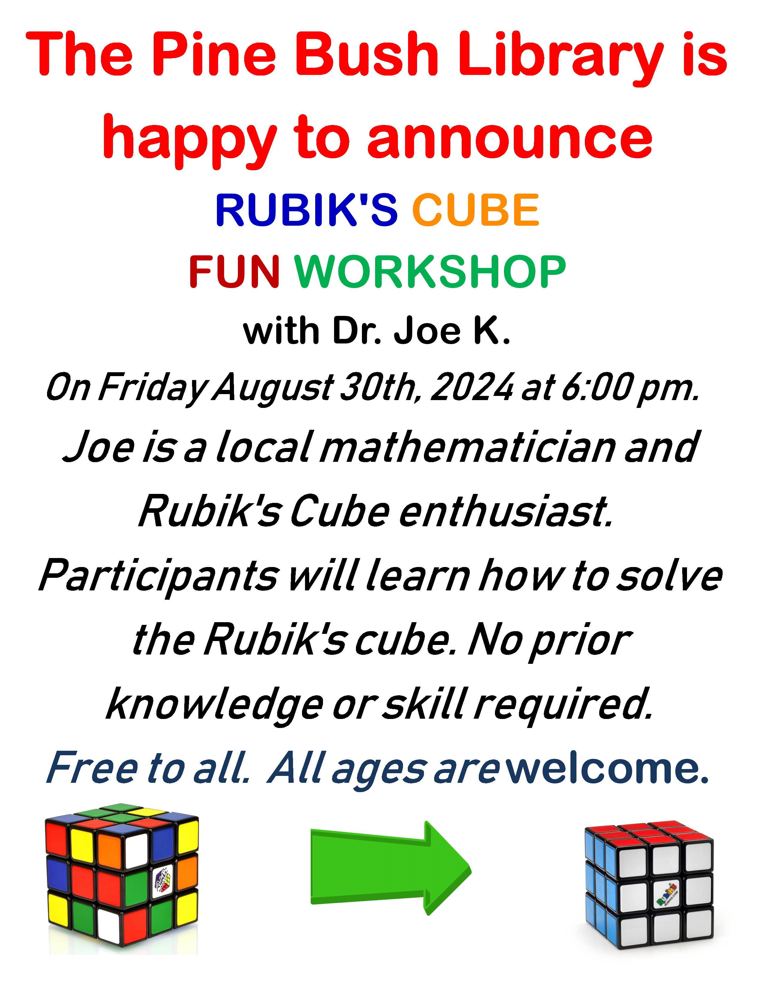 New Date!!! Posted on August 16, 2024 by pinebushlibrary We have a new date for the Rubik’s Cube Workshop!!!!!!! Share this: Click to share on Facebook (Opens in new window) Facebook Click to print (Opens in new window) Print Click to email a link to a friend (Opens in new window) Email Click to share on LinkedIn (Opens in new window) LinkedIn Like Loading... Related