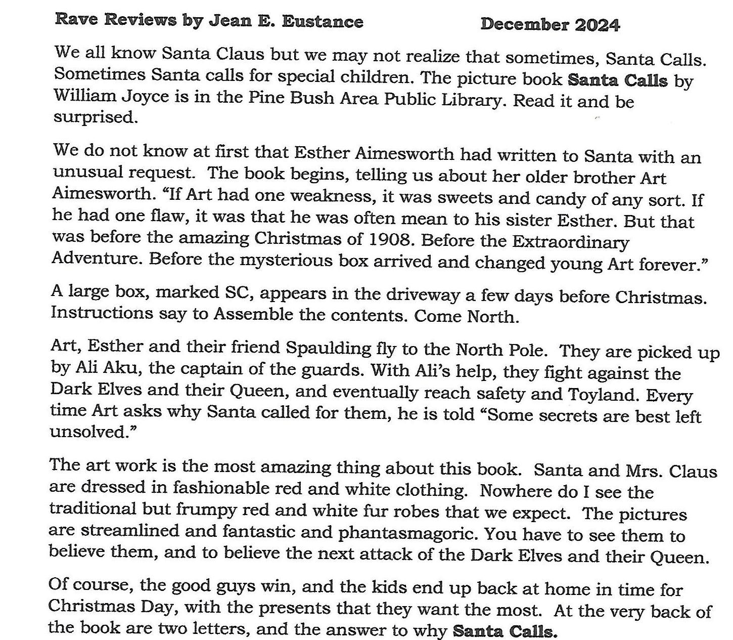 Rave Reviews by Jean Eustance Posted on December 1, 2024 by pinebushlibrary Share this: Click to share on Facebook (Opens in new window) Facebook Click to print (Opens in new window) Print Click to email a link to a friend (Opens in new window) Email Click to share on LinkedIn (Opens in new window) LinkedIn Like Loading... Related
