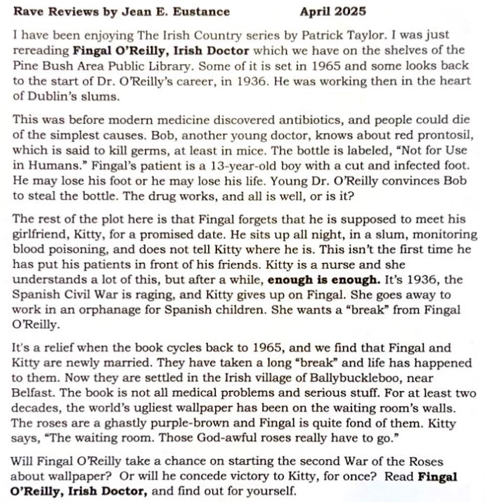 Rave Reviews by Jean E. Eustance Posted on March 28, 2025 by pinebushlibrary Share this: Click to share on Facebook (Opens in new window) Facebook Click to print (Opens in new window) Print Click to email a link to a friend (Opens in new window) Email Click to share on LinkedIn (Opens in new window) LinkedIn Like Loading... Related