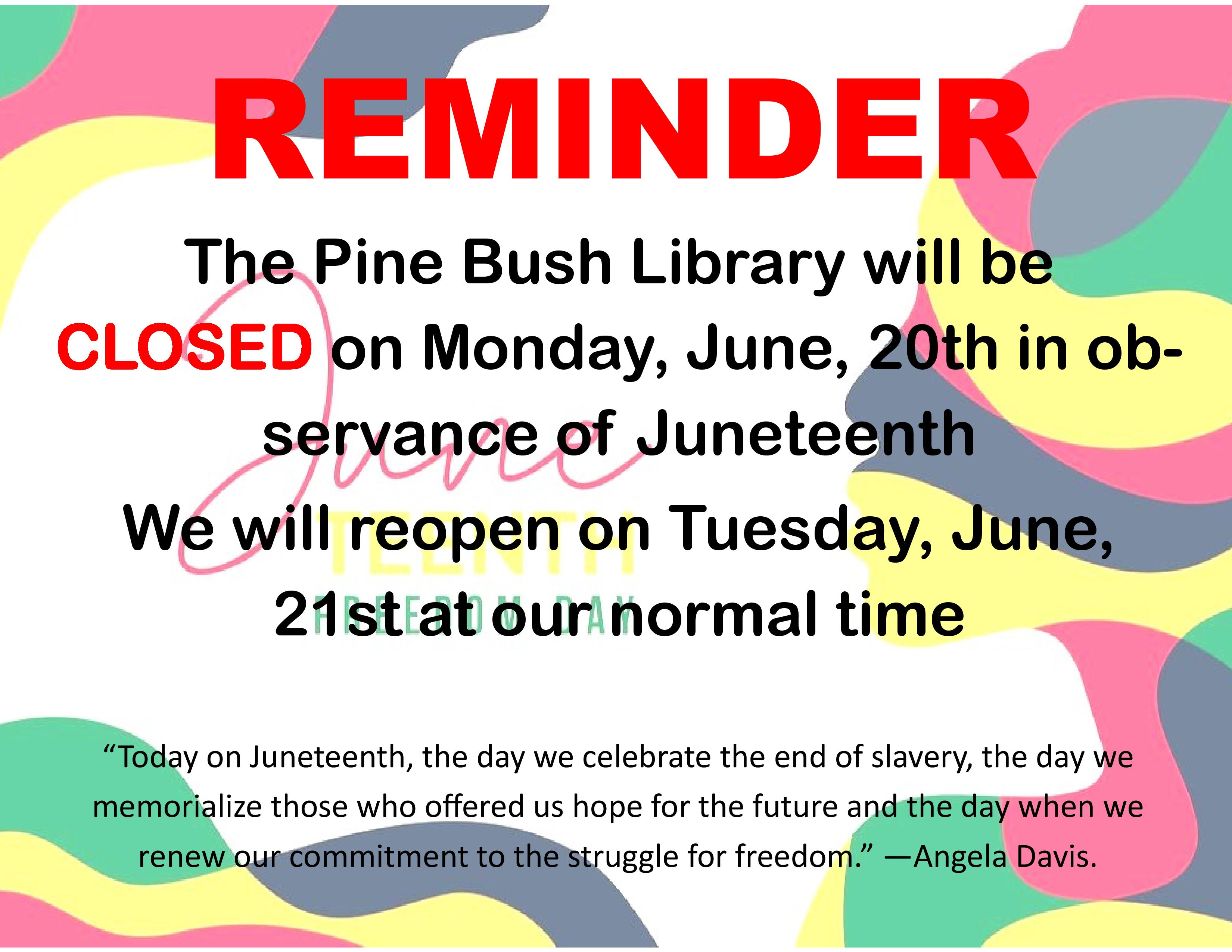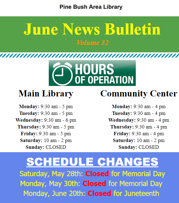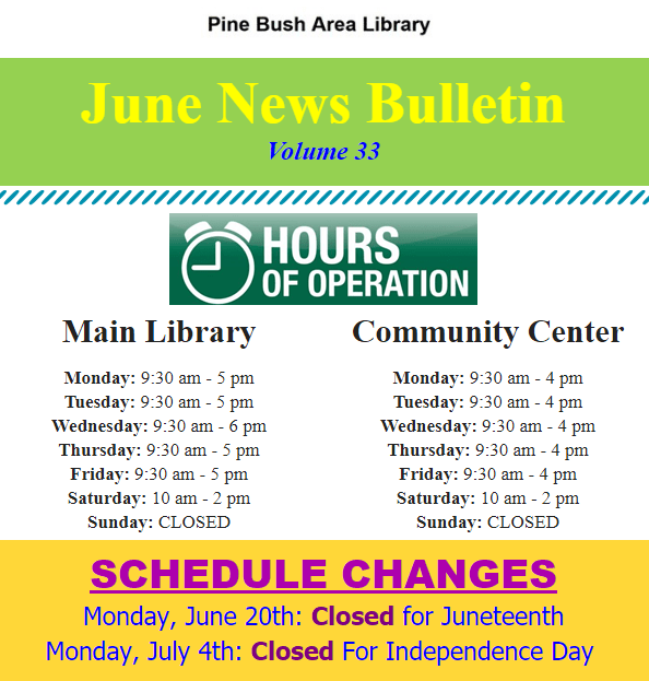 The staff of the Pine Bush Library would like to wish all of you a healthy, happy and safe summer. Keep an eye on our website and Facebook page to keep up with everything going on at the library this summer.