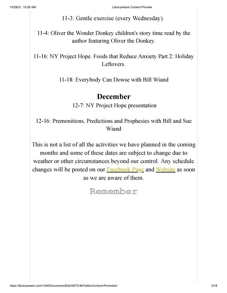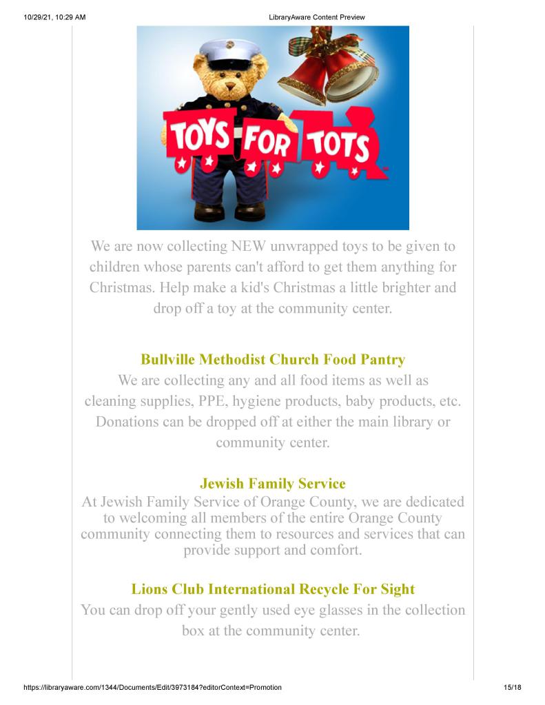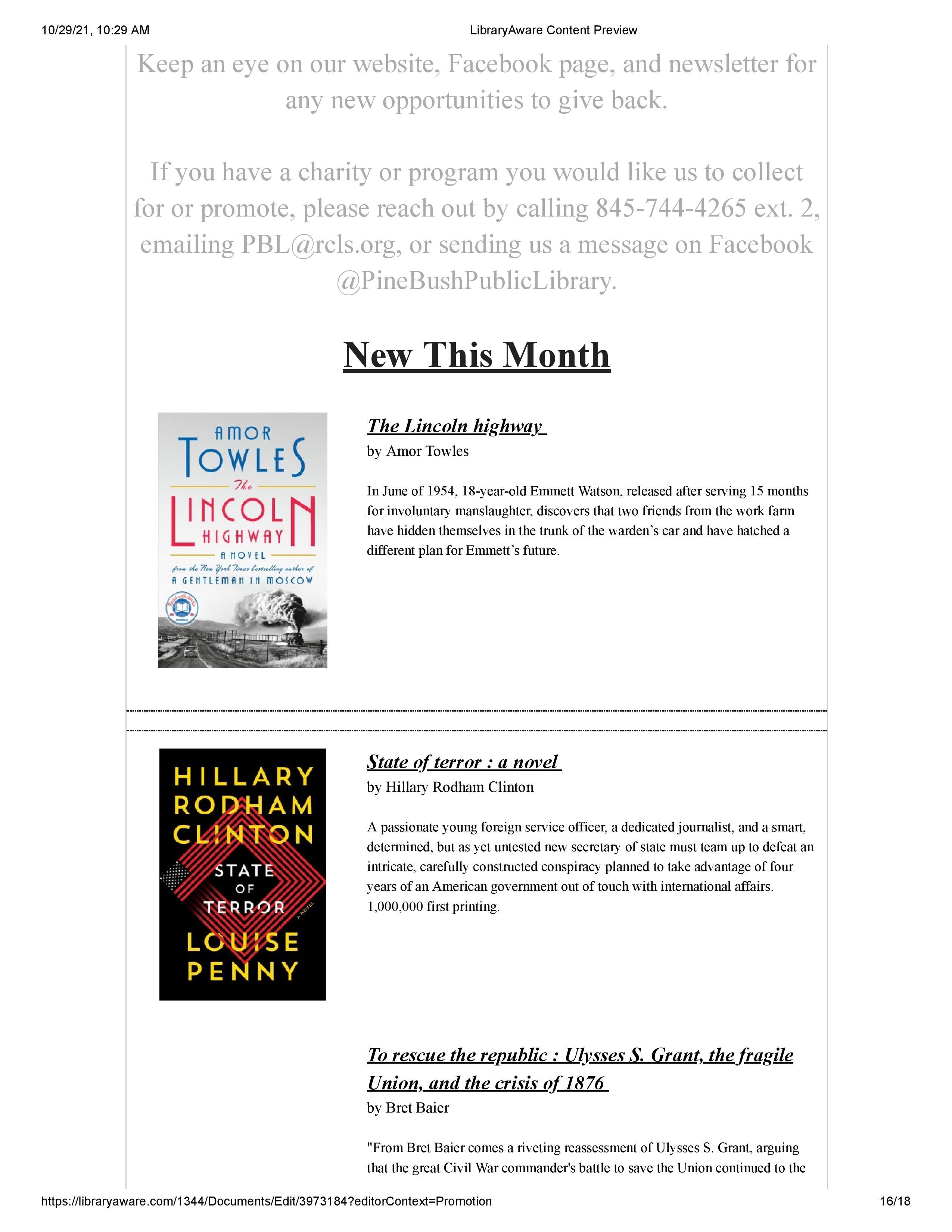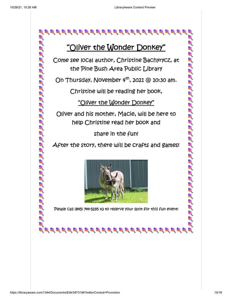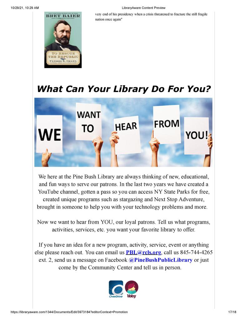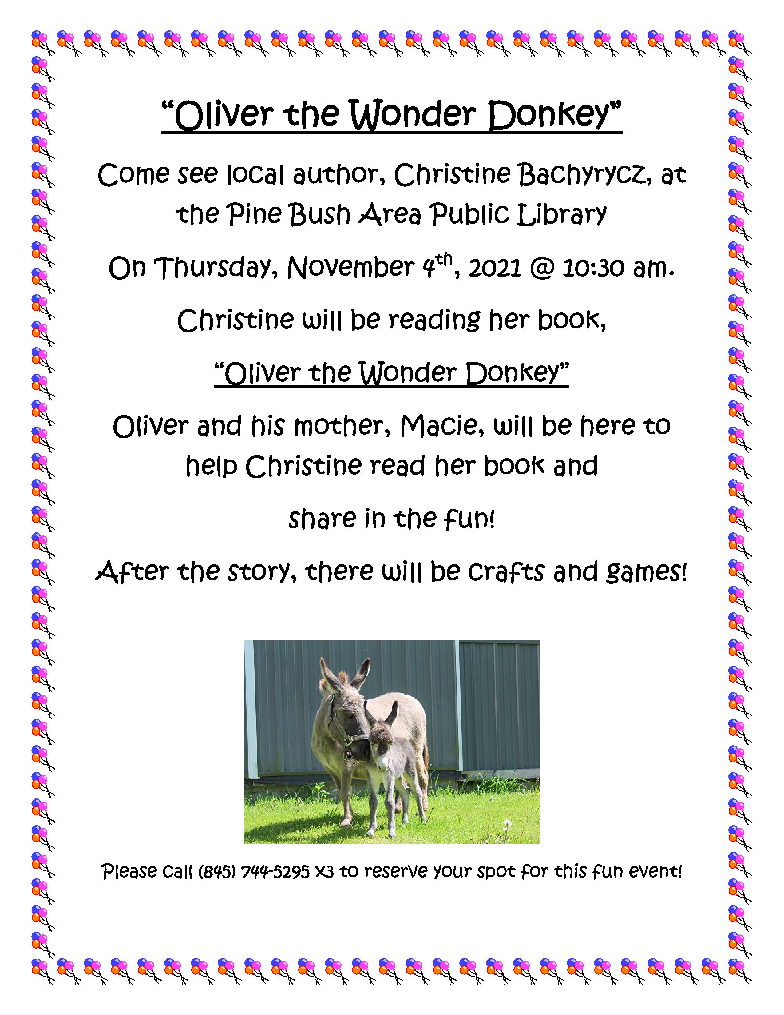 This year the Pine Bush Library participated in the Great Give Back by providing donated goods to Equine Rescue Resource (Colleen & John) and Reclaimed Dignity (V and Nat). These rescues are small self-sustaining rescues that provide wonderful homes for displaced and rescued animals. We would like to thank all the patrons who donated items to the library for this program.