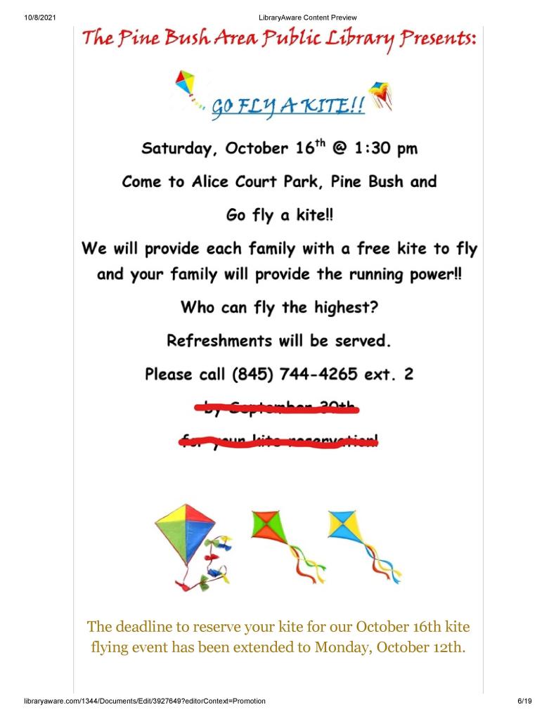 Join the Pine Bush Library for some good old fashioned kite flying.Saturday, October 16th @ 1:30 pm