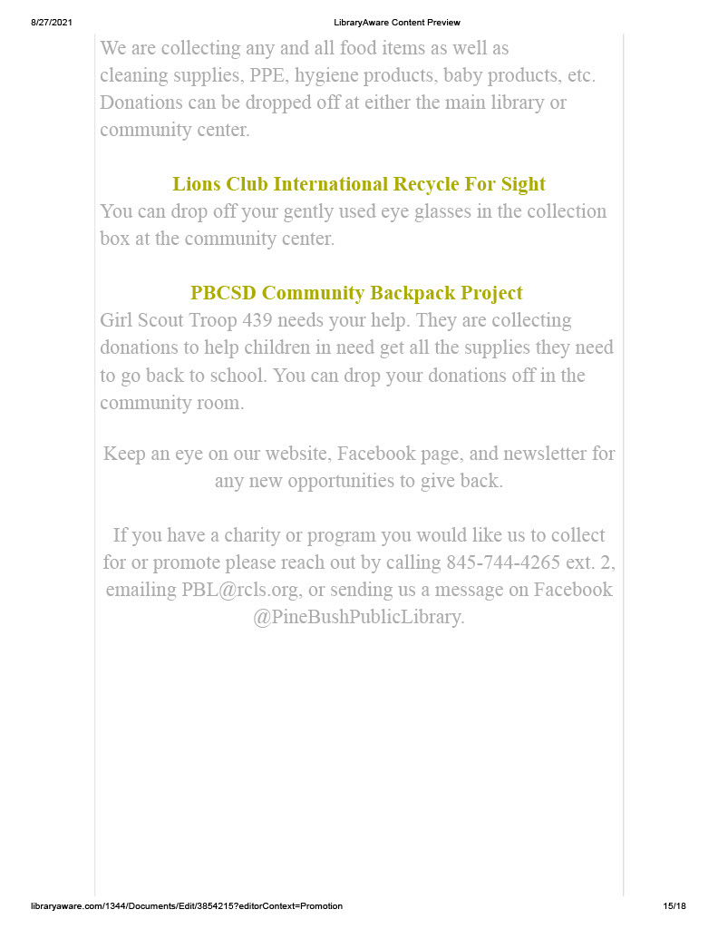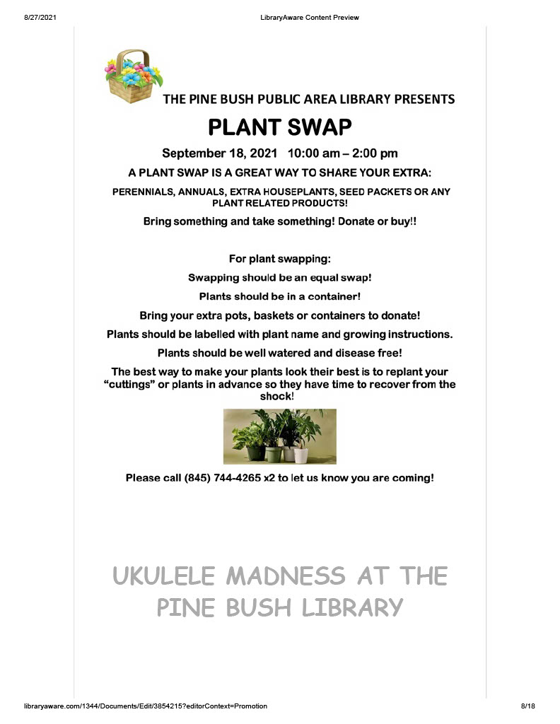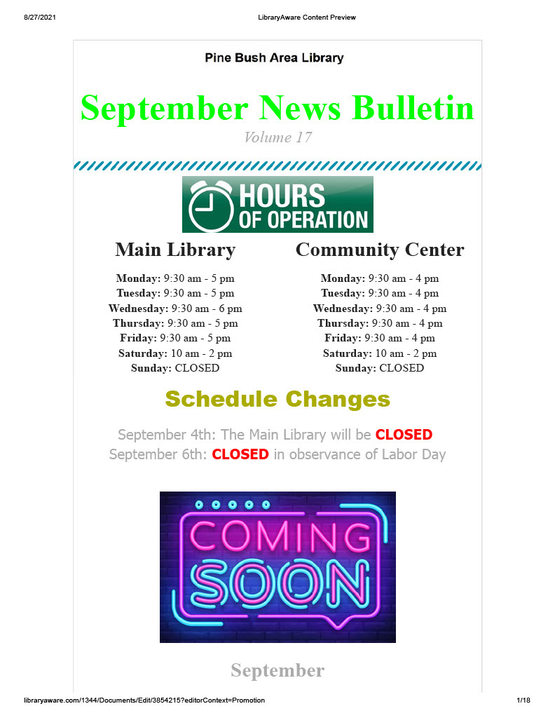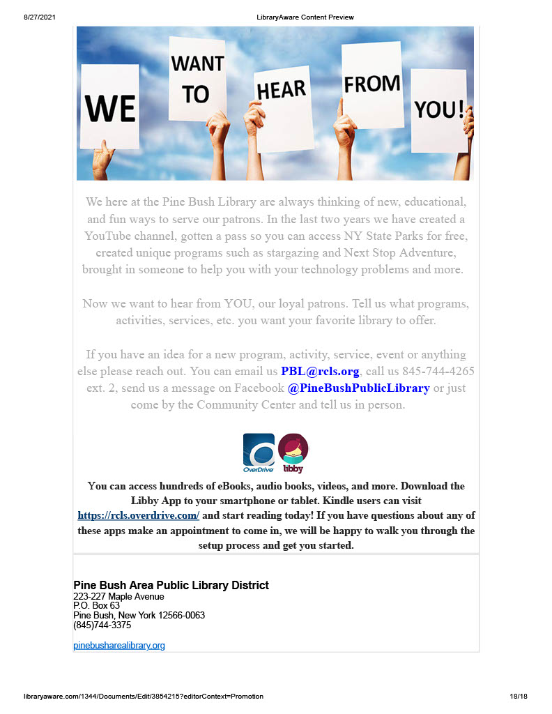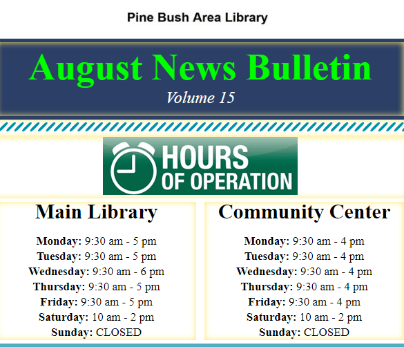Our August news letter has been sent out. If you didn’t receive it and would like to we need your email address. You can email it to us at PBL@rcls.org, send us a privet message on Facebook or give us a call 845-744-4265 ext. 2.For anyone who wants a paper copy they will be available in the community center and main library.
