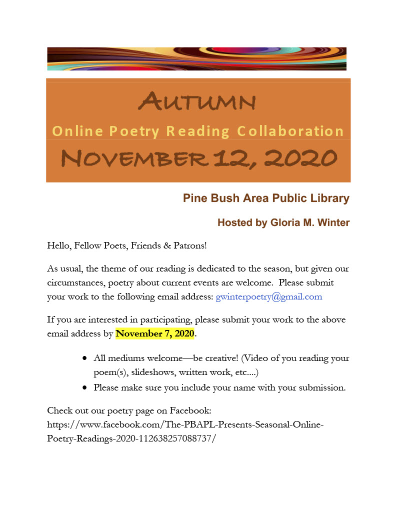 See our website pinebusharealibrary.org for more information or call 845-744-4265 ex.2